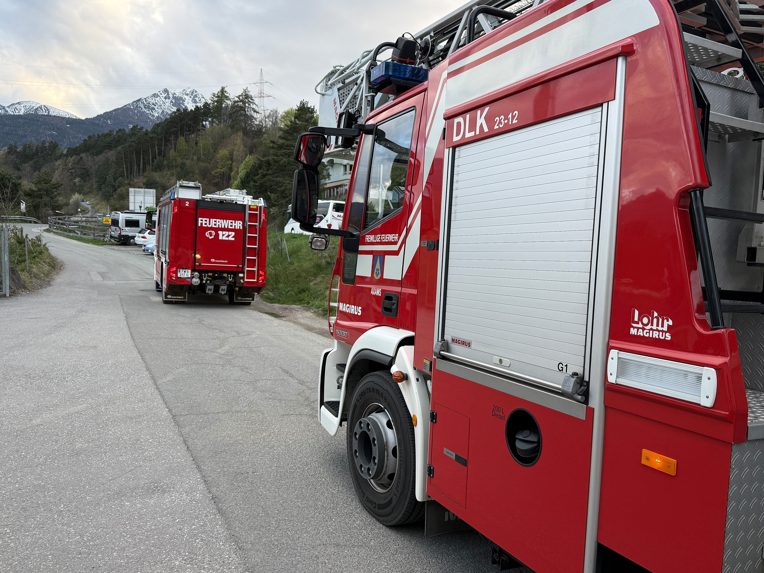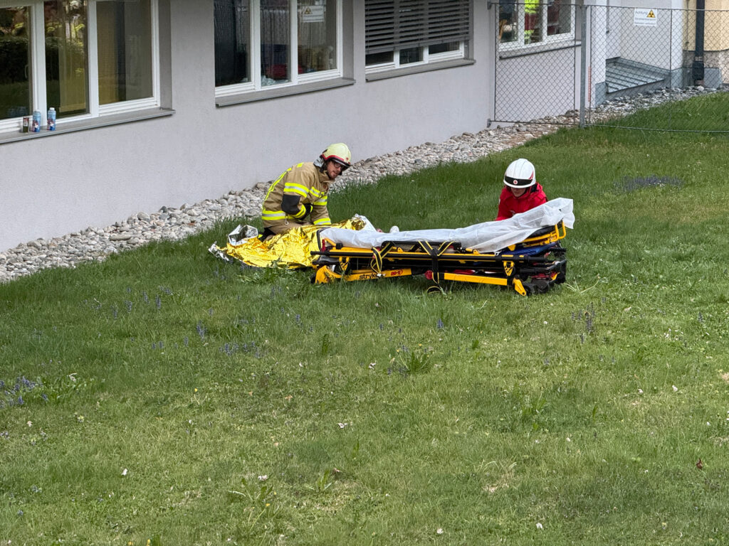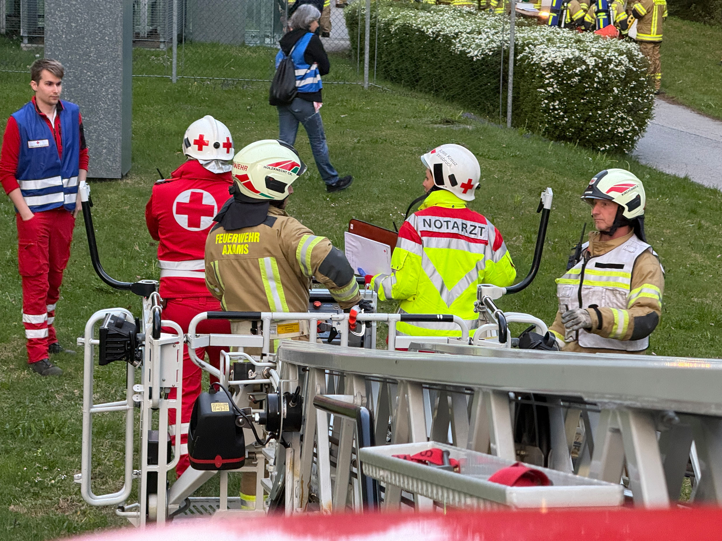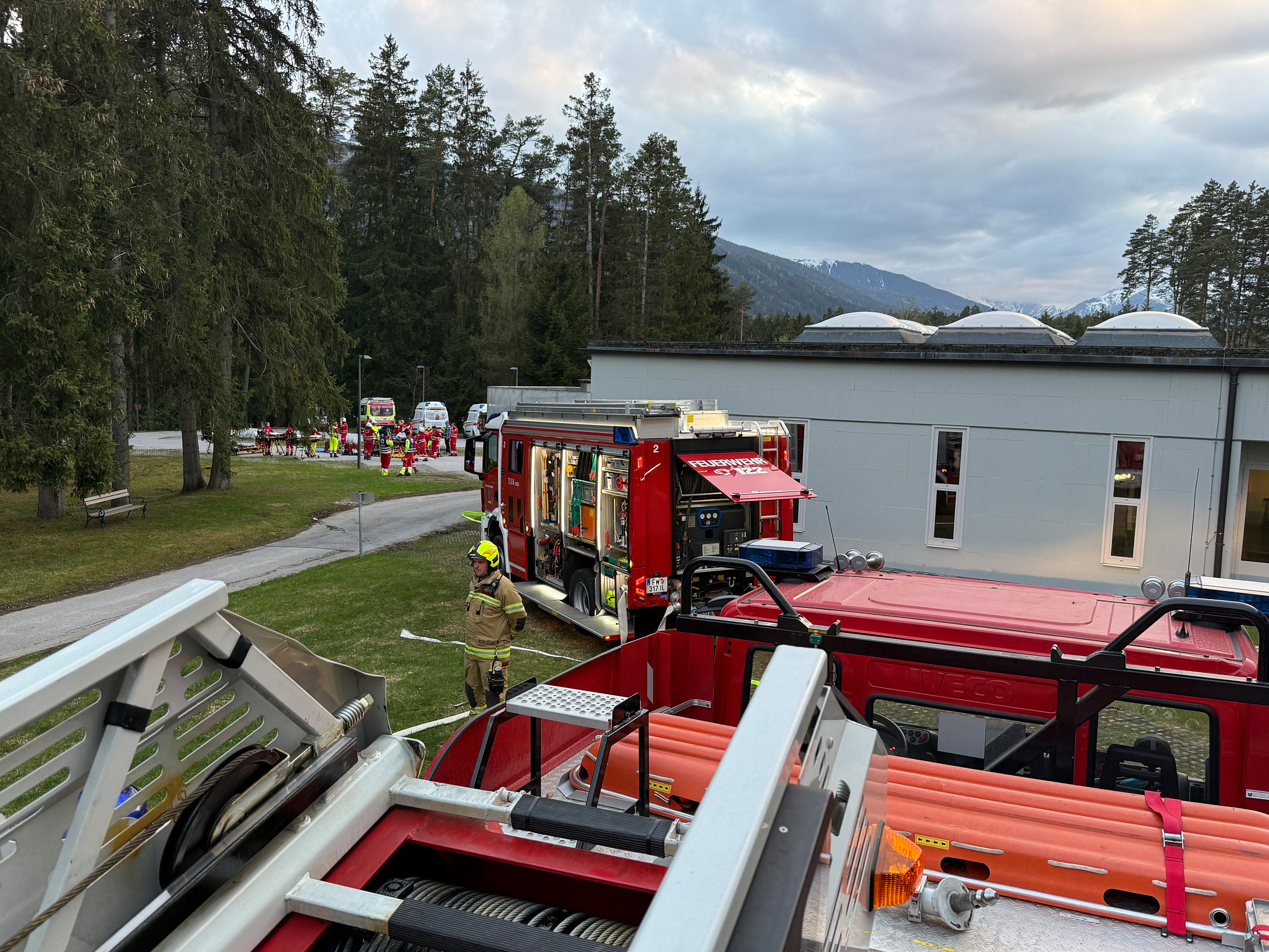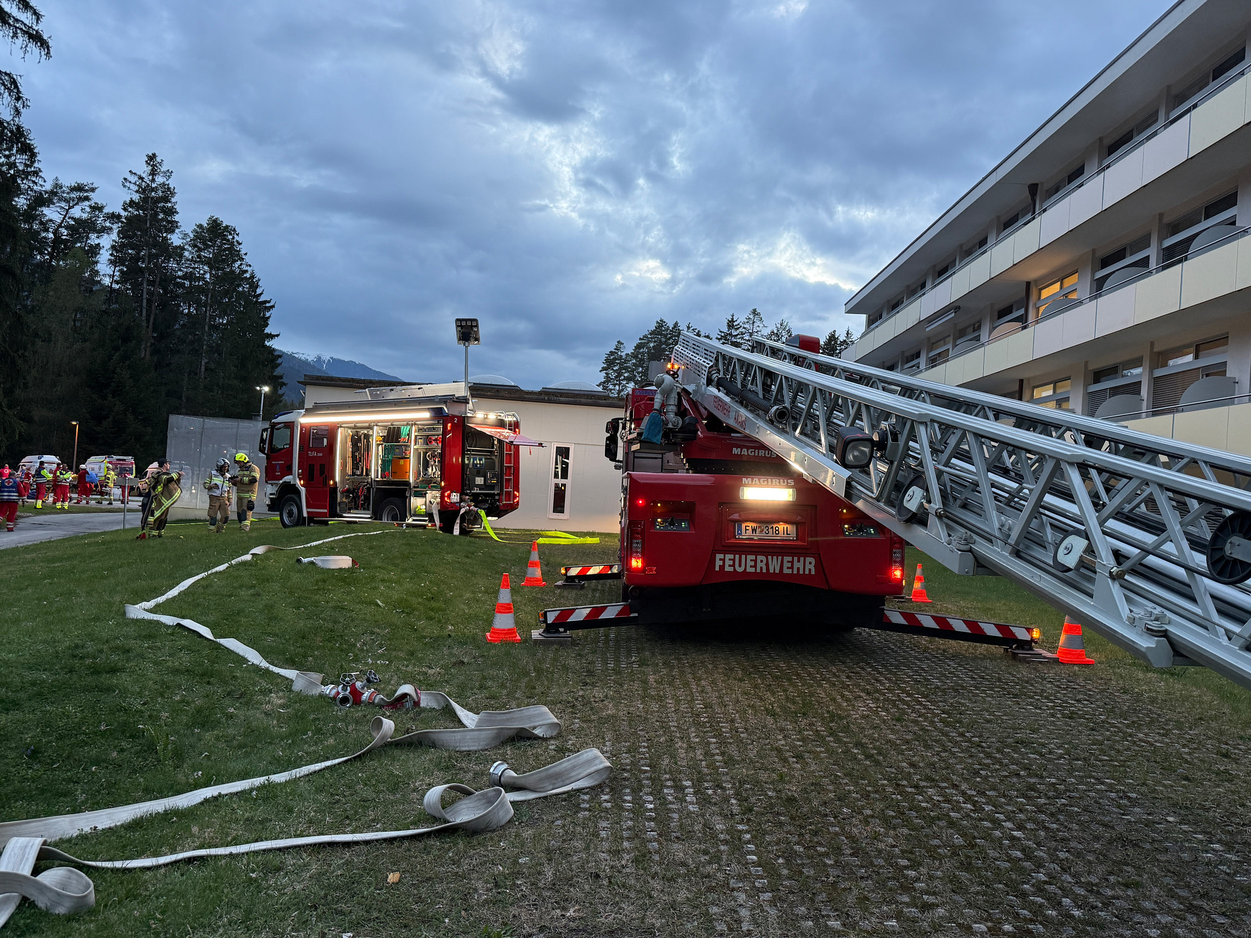 Die Feuerwehr Axams übernahm dabei die Aufgabe, die Drehleiter an der südlichen Gebäudeseite in Bereitschaft zu stellen. Zudem durchsuchte der Atemschutztrupp des Tanklöschfahrzeuges 2 die Räumlichkeiten des vierten Obergeschosses gezielt nach vermissten Personen.