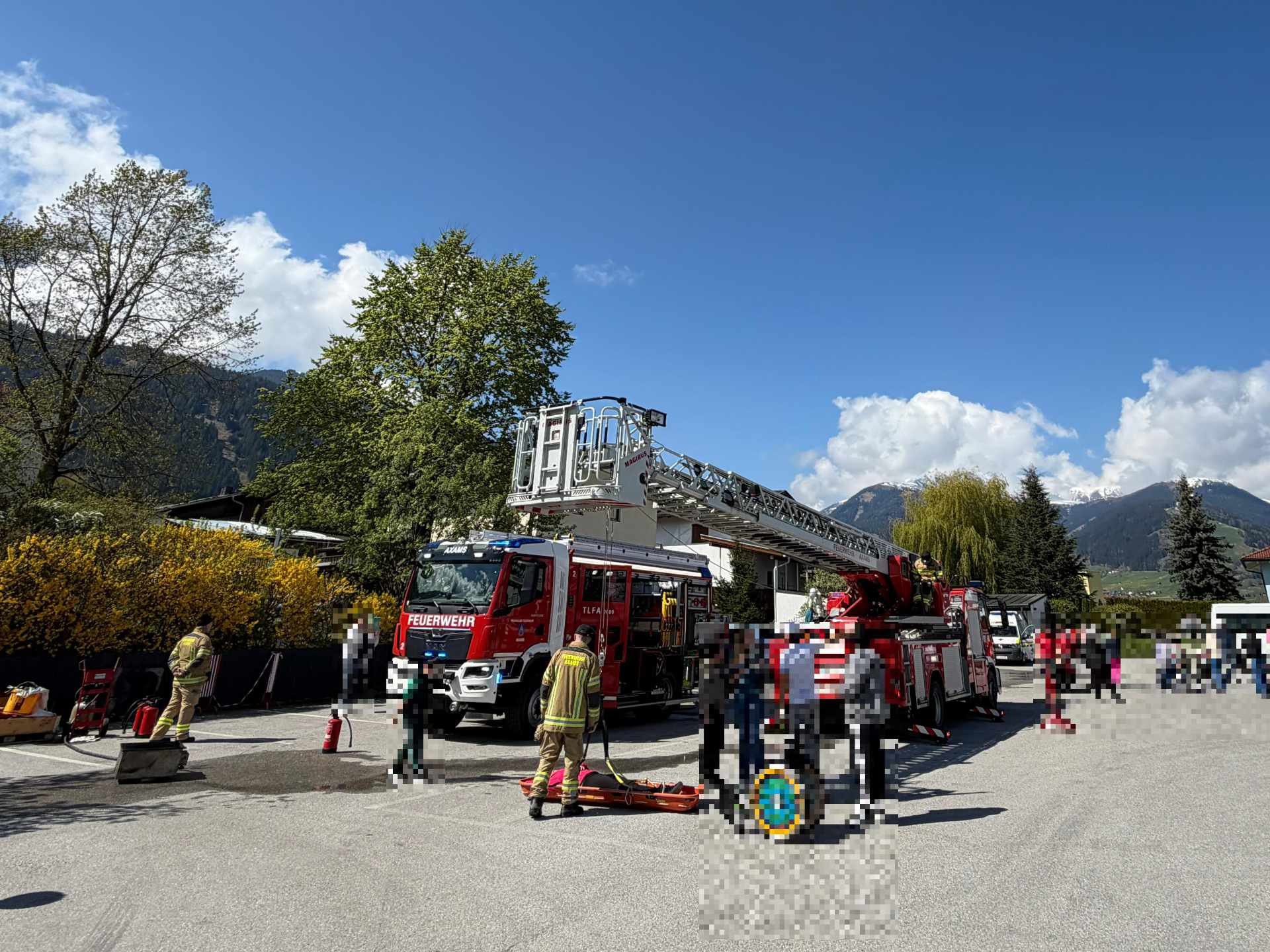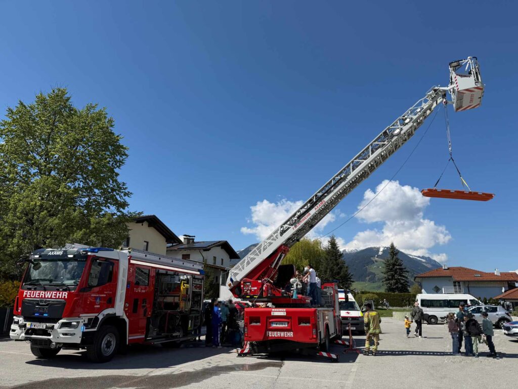 Am Mittwoch präsentierte die Freiwillige Feuerwehr Axams gemeinsam mit anderen Einsatzorganisationen ihre Fahrzeuge im Rahmen eines Blaulichttages beim Elisabethinum in Axams. Die Feuerwehr war mit dem Tanklöschfahrzeug 2 sowie der Drehleiter vor Ort vertreten und bot den Besuchern Einblicke in die moderne Ausrüstung und Technik.