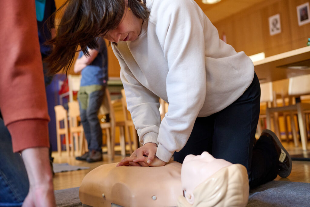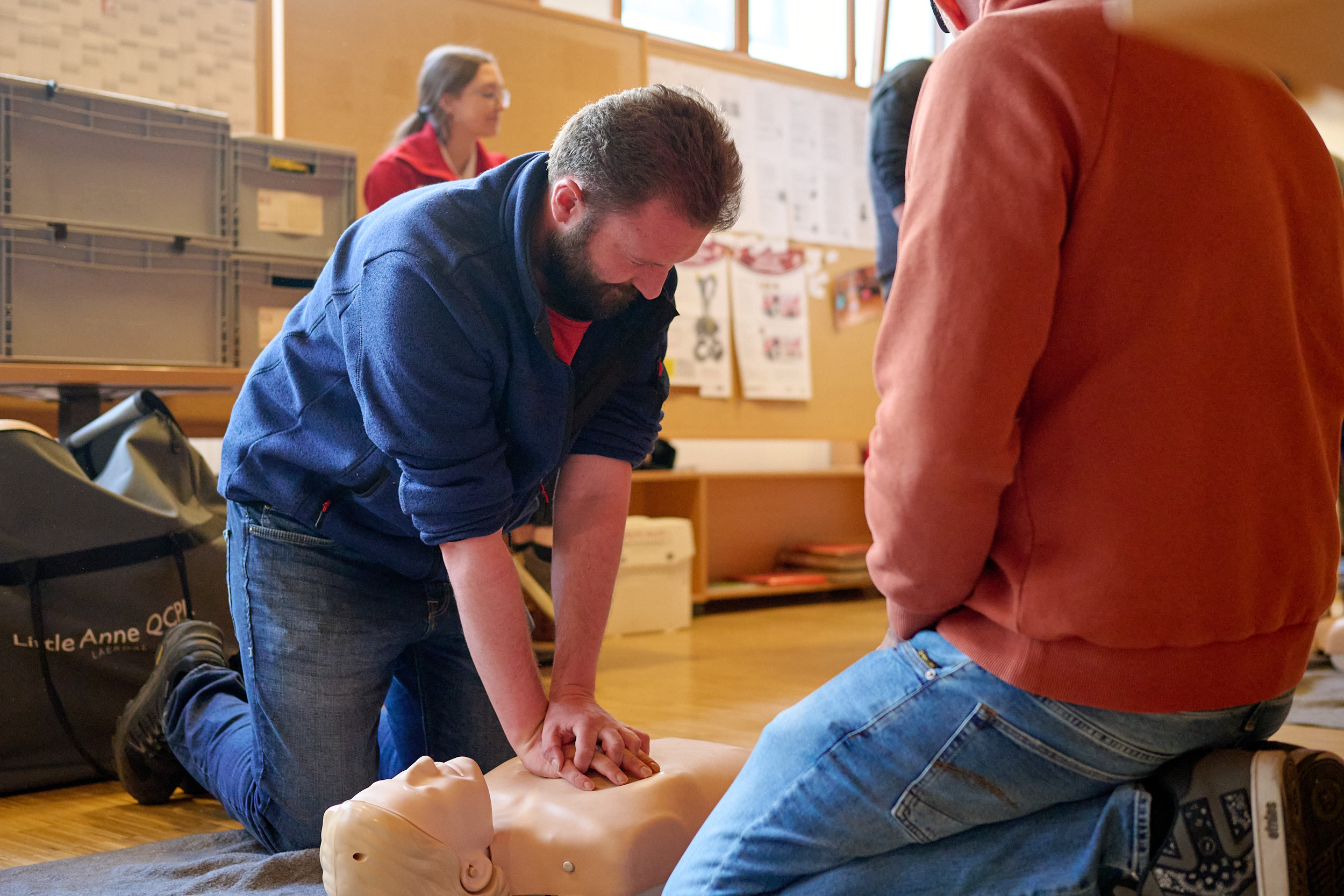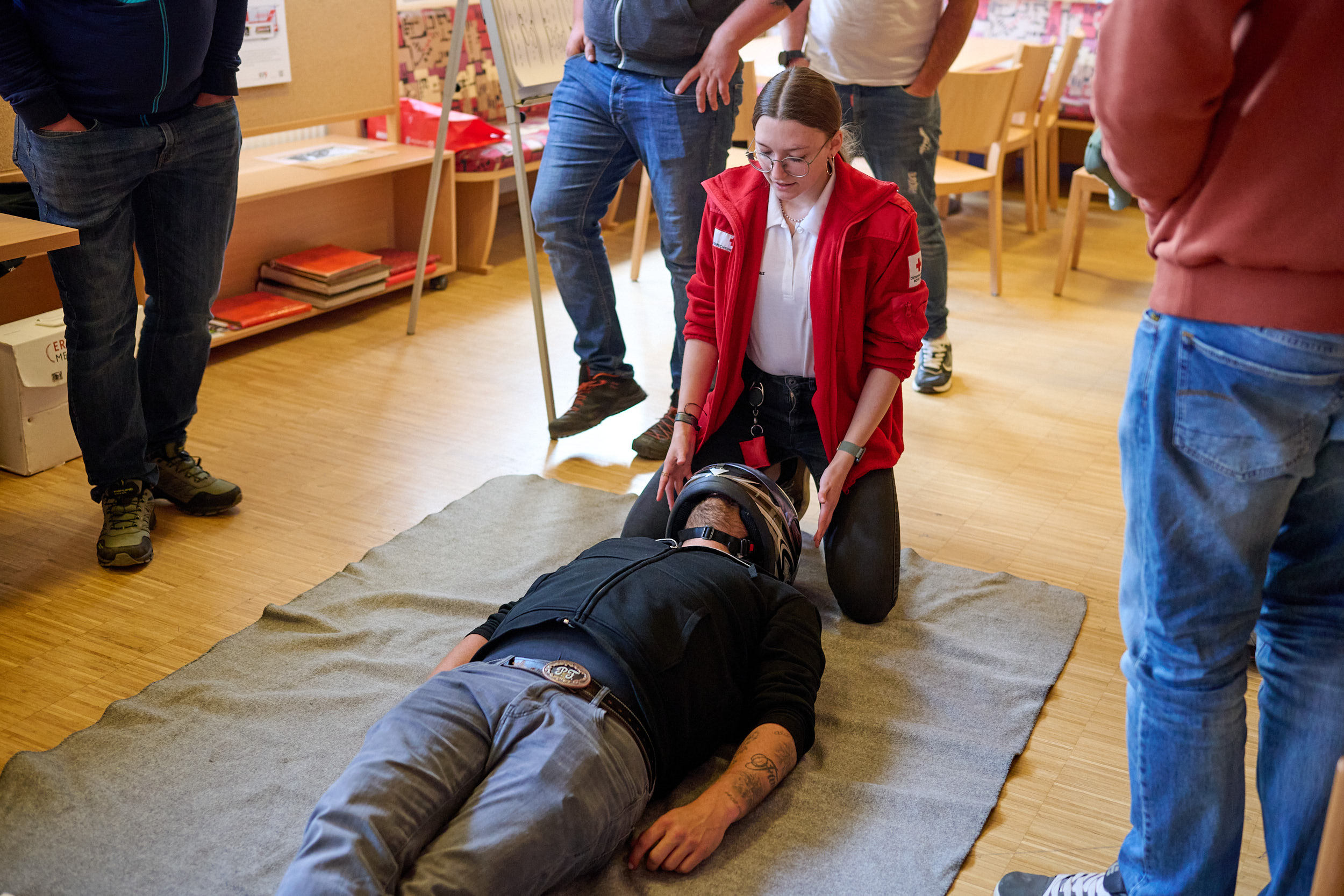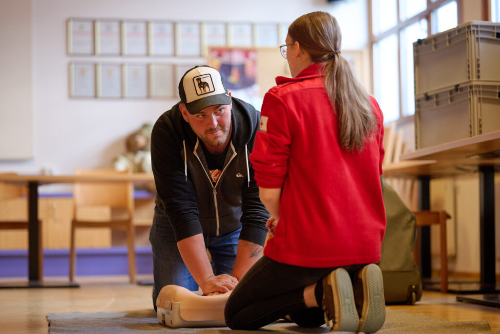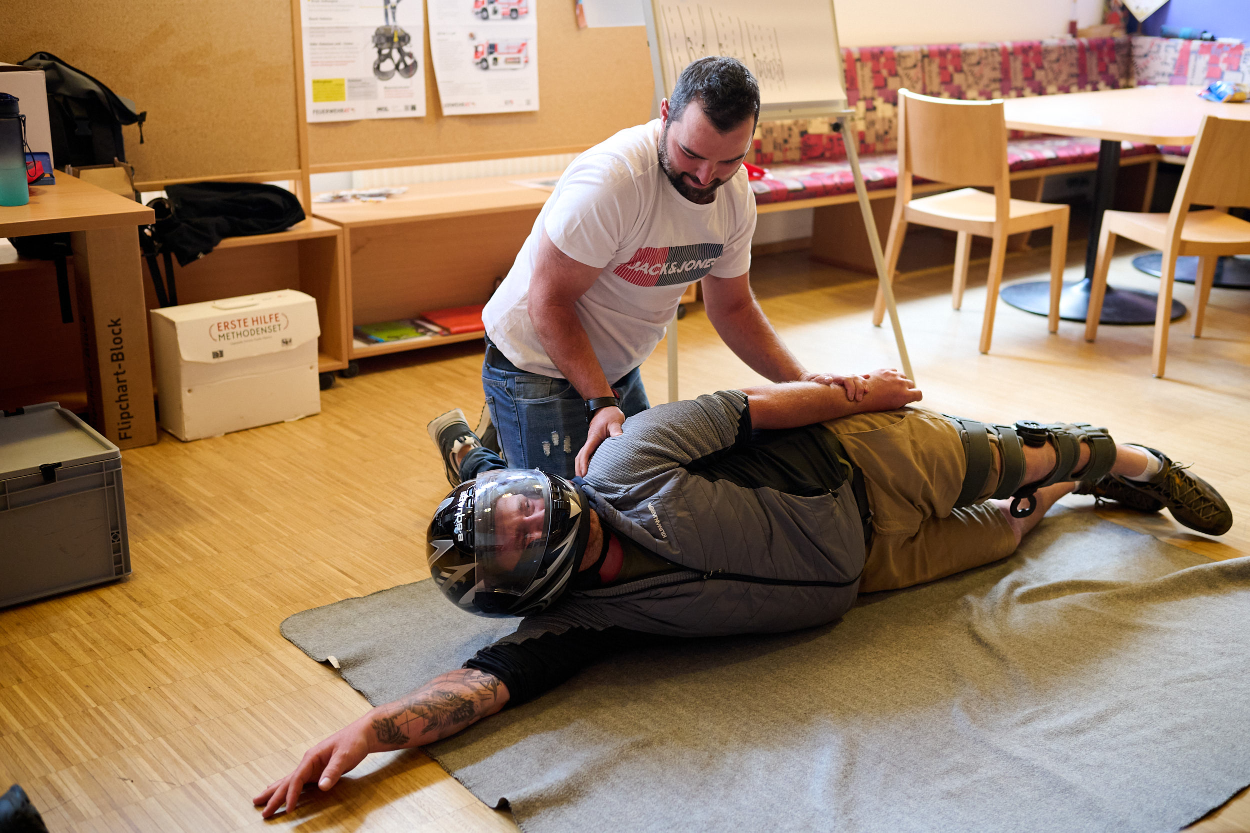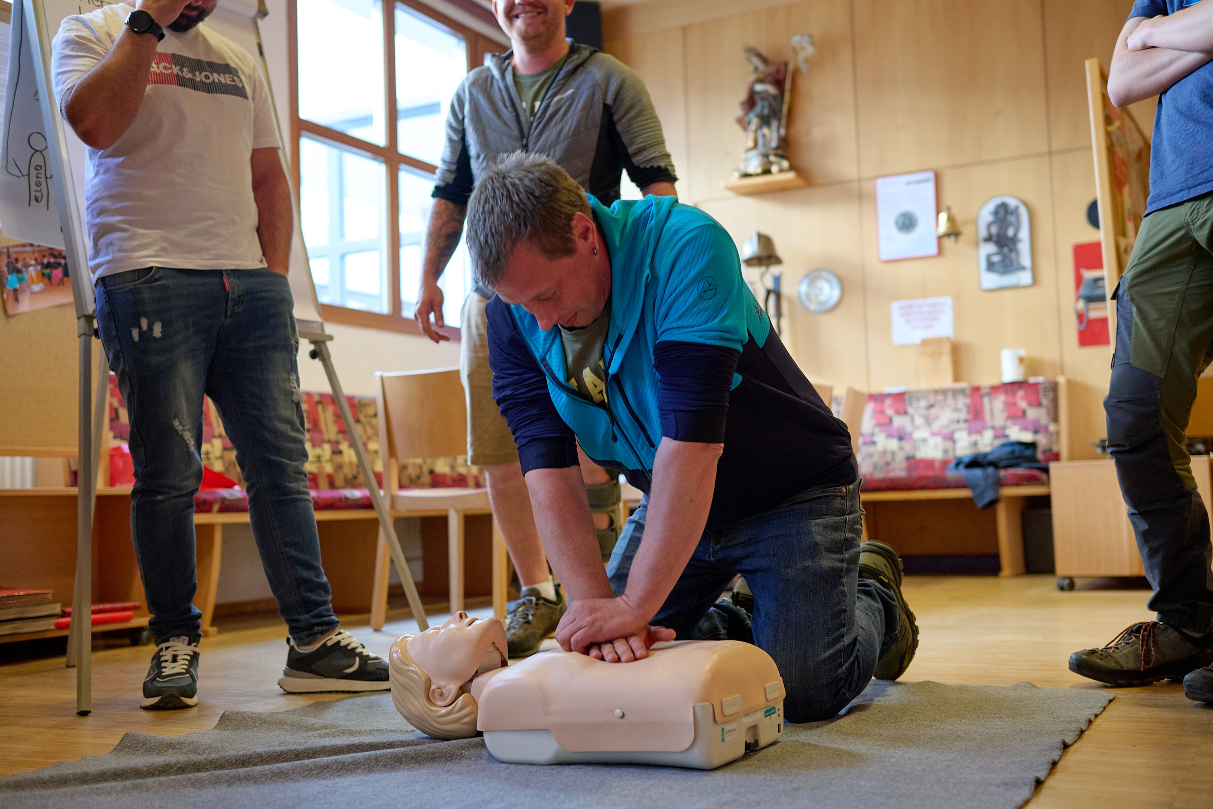 Im Rahmen der Präsenzschulung vertieften die Teilnehmer ihr Wissen in lebensrettenden Maßnahmen wie der Wiederbelebung, der Beatmung und der stabilen Seitenlage. Zudem wurden die korrekte Wundversorgung sowie das Retten von Verletzten aus Fahrzeugen geübt.