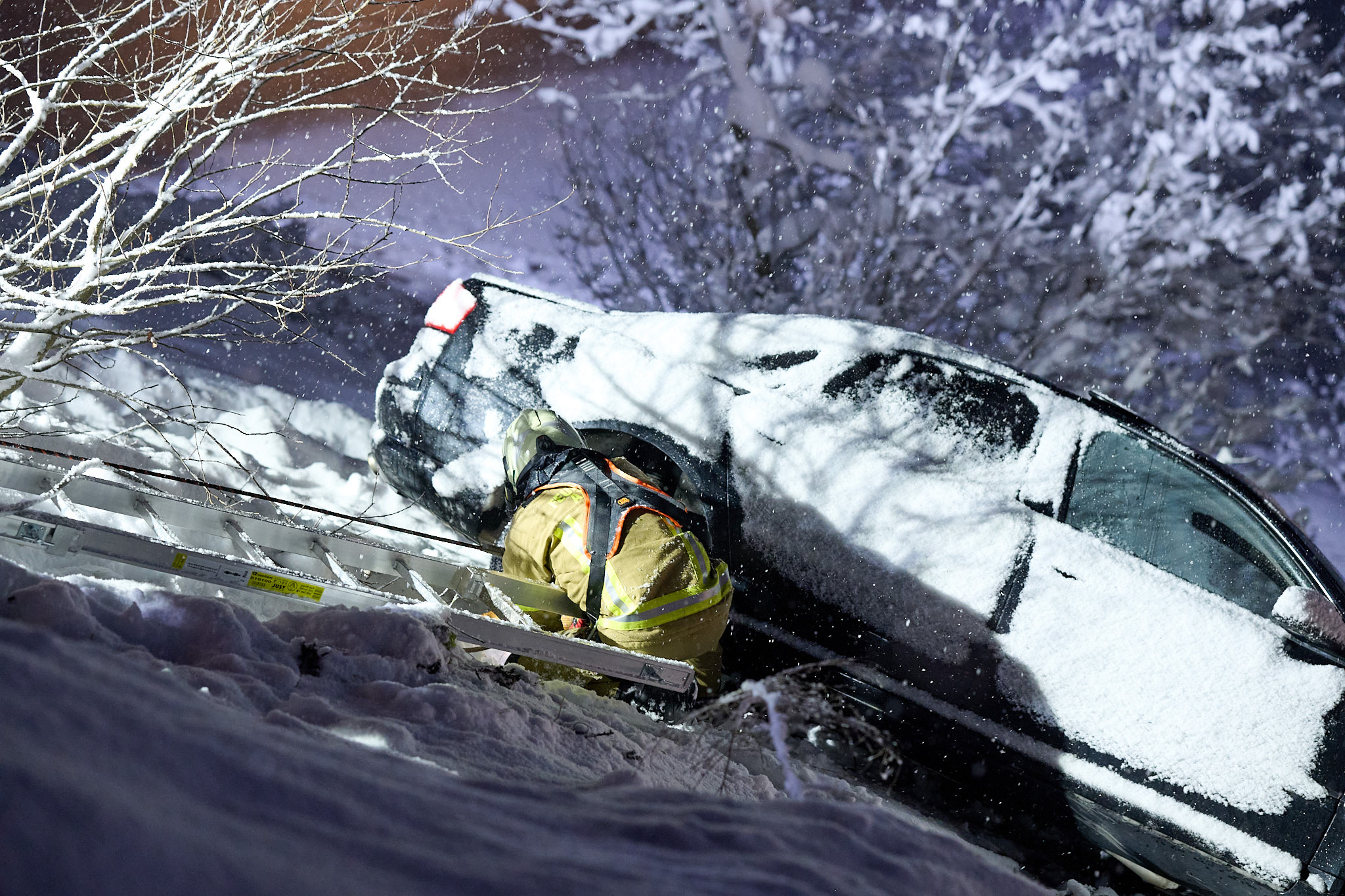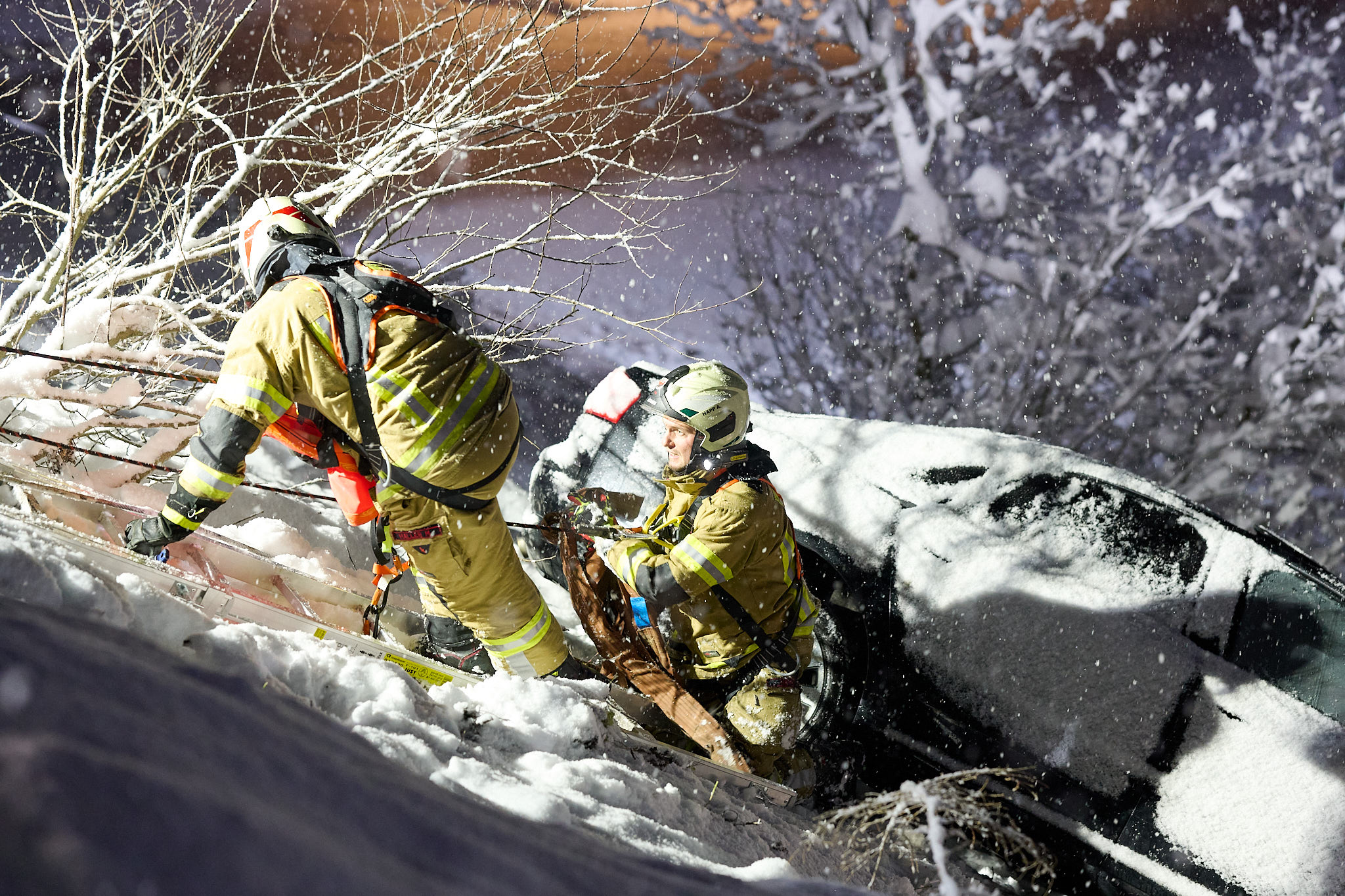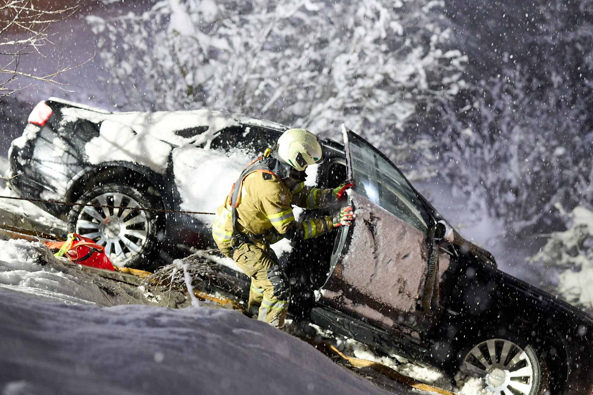 Vor Ort bestätigte sich die Erstmeldung. Auf der schneebedeckten Fahrbahn war ein Lenker mit seinem Fahrzeug über die Böschung ca. 4 Meter abgestürzt. Die Einsatzkräfte verschafften sich mit Anseilschutz und mehreren Steckleiterteilen einen Zugang zum Fahrzeug und sicherten dieses mithilfe der Seilwinde des TLFA Götzens gegen ein weiteres abrutschen. Anschließend halfen die Einsatzkräfte dem Lenker aus dem Fahrzeug und übergaben ihn an den Rettungsdienst. Während die Einsatzkräfte auf den Abschleppdienst warteten kam seitens der Leitstelle Tirol die Information über einen weiteren Einsatz. Ein Küchenbrand in Birgitz verlangte, dass sich die nicht mehr benötigten Fahrzeuge umgehend auf den Weg zum Brandeinsatz machten. Die verbleibenden Kräfte unterstützen den Abschleppdienst bei der Fahrzeugbergung bevor der Einsatz beendet wurde.