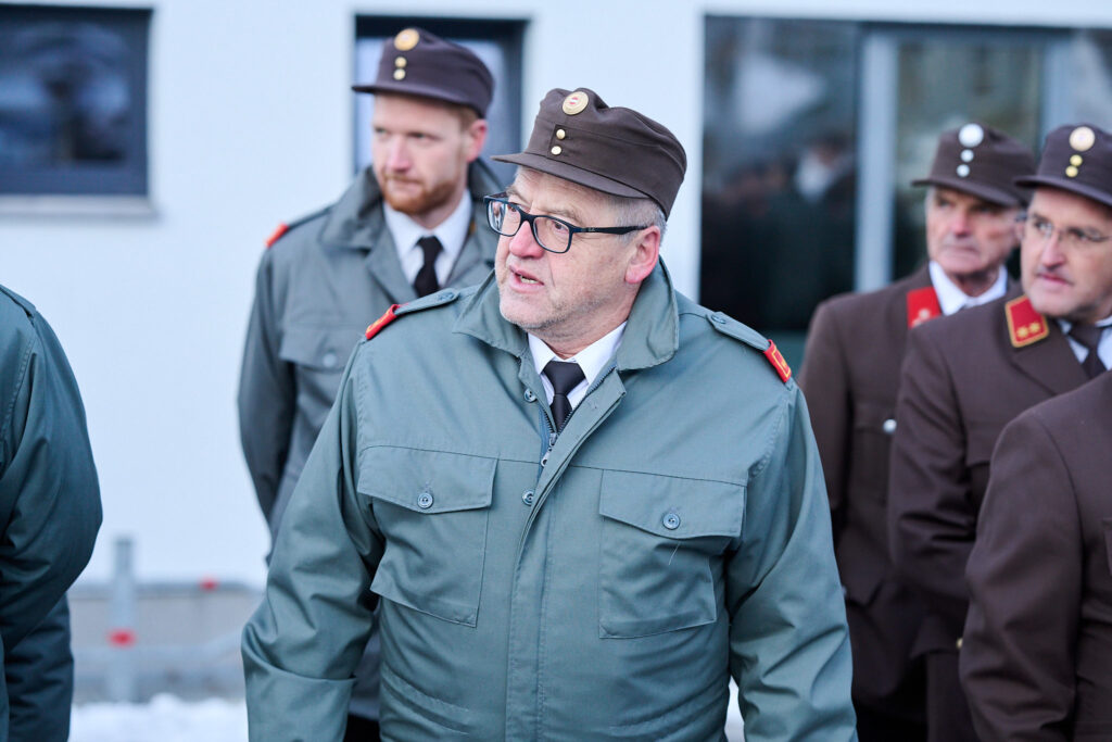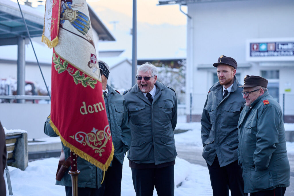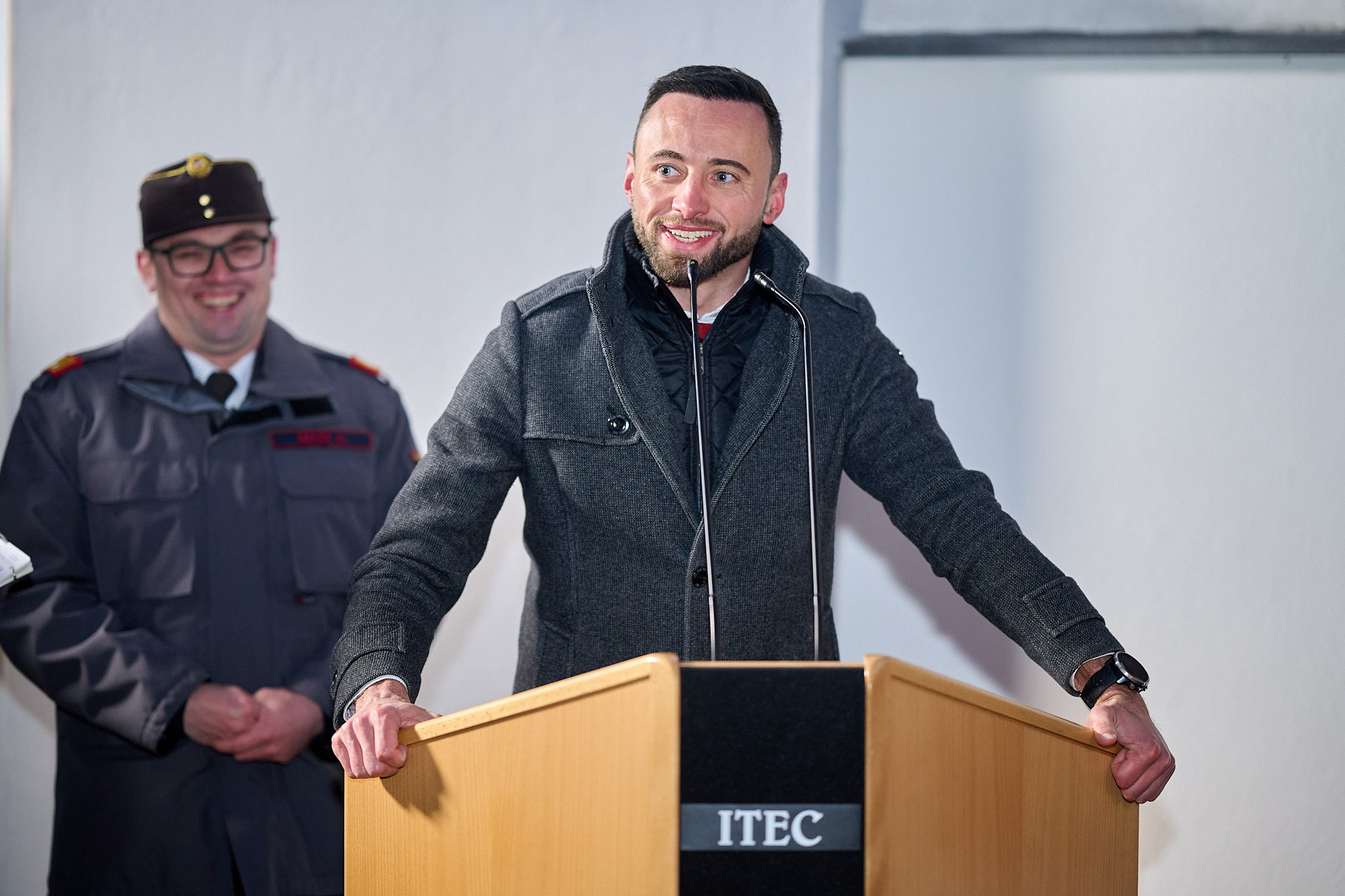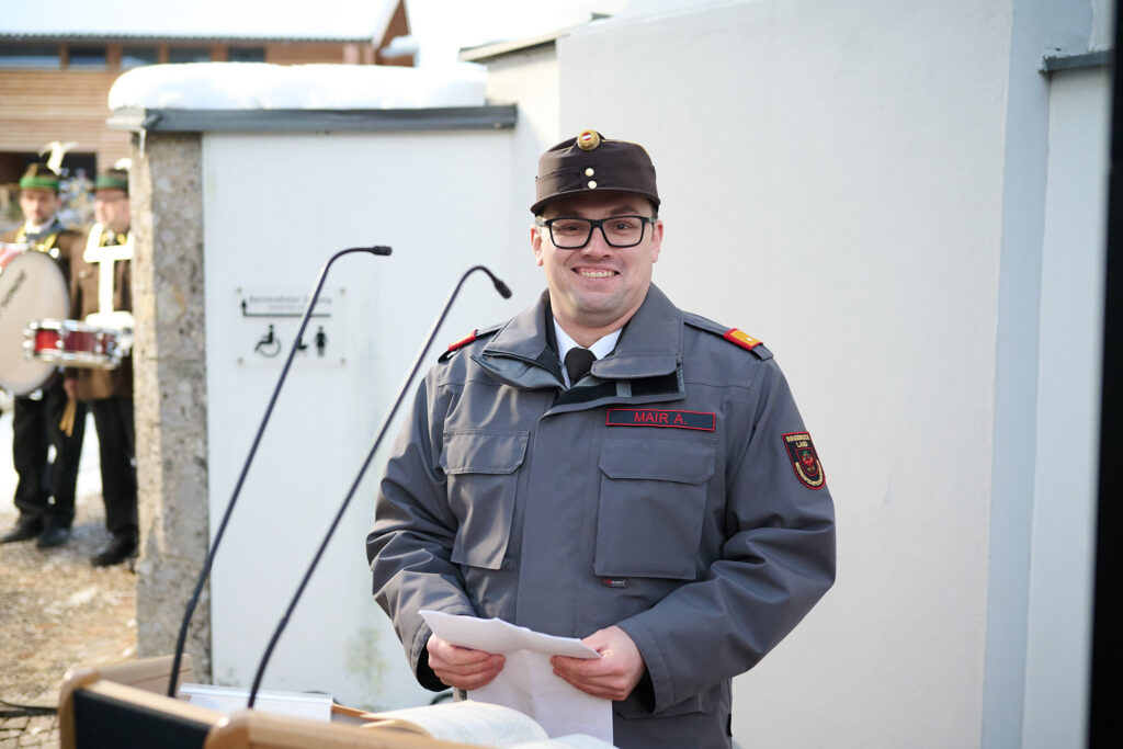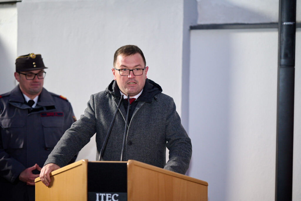 Bürgermeister Thomas Suitner hielt seine Ansprache den winterlichen Bedingungen entsprechend kurz, verband seine Glückwünsche jedoch mit einer humorvollen Anekdote, die den Zuhörern ein Lächeln ins Gesicht zauberte.