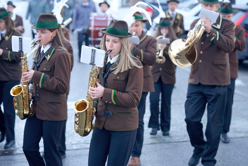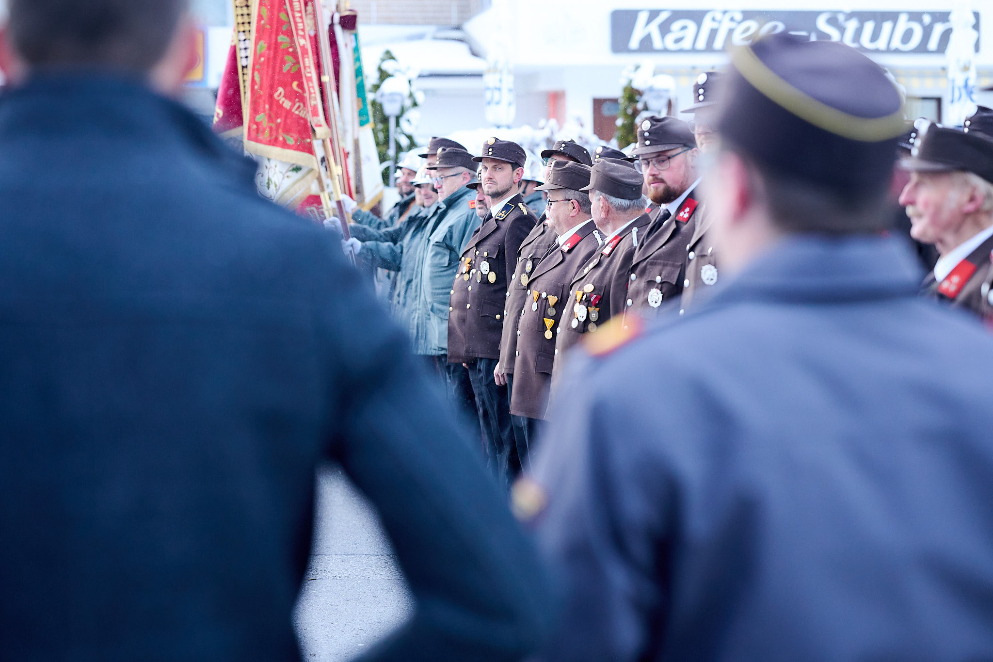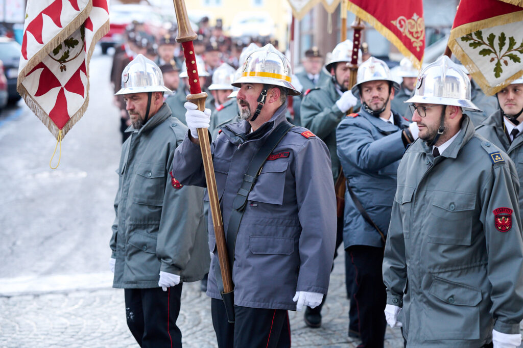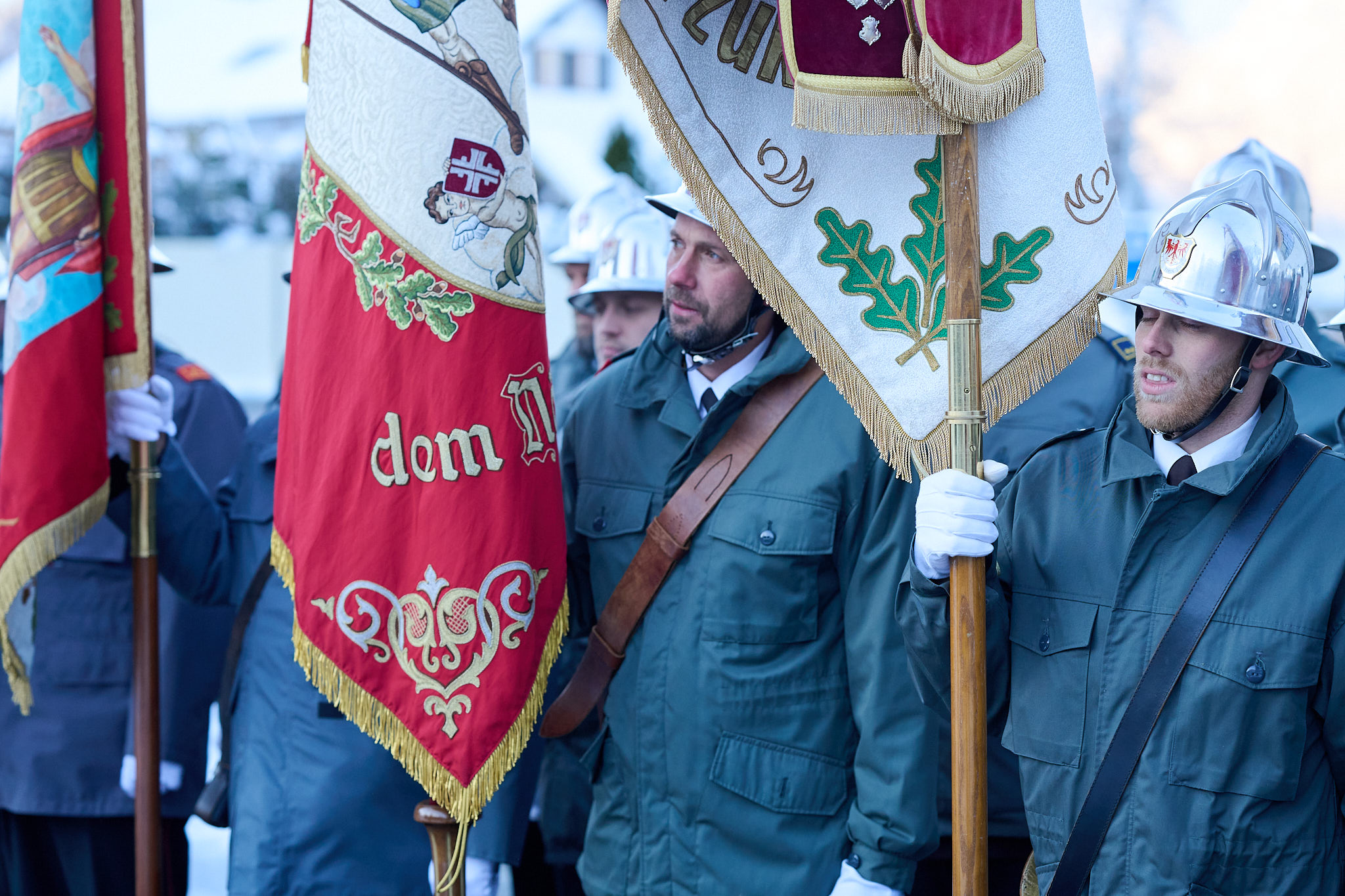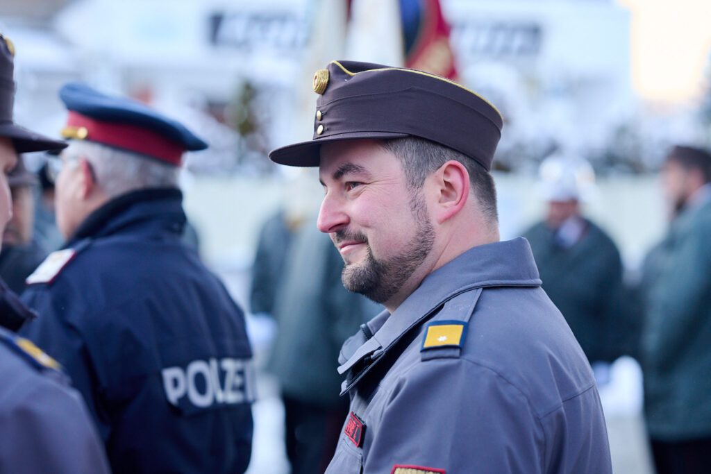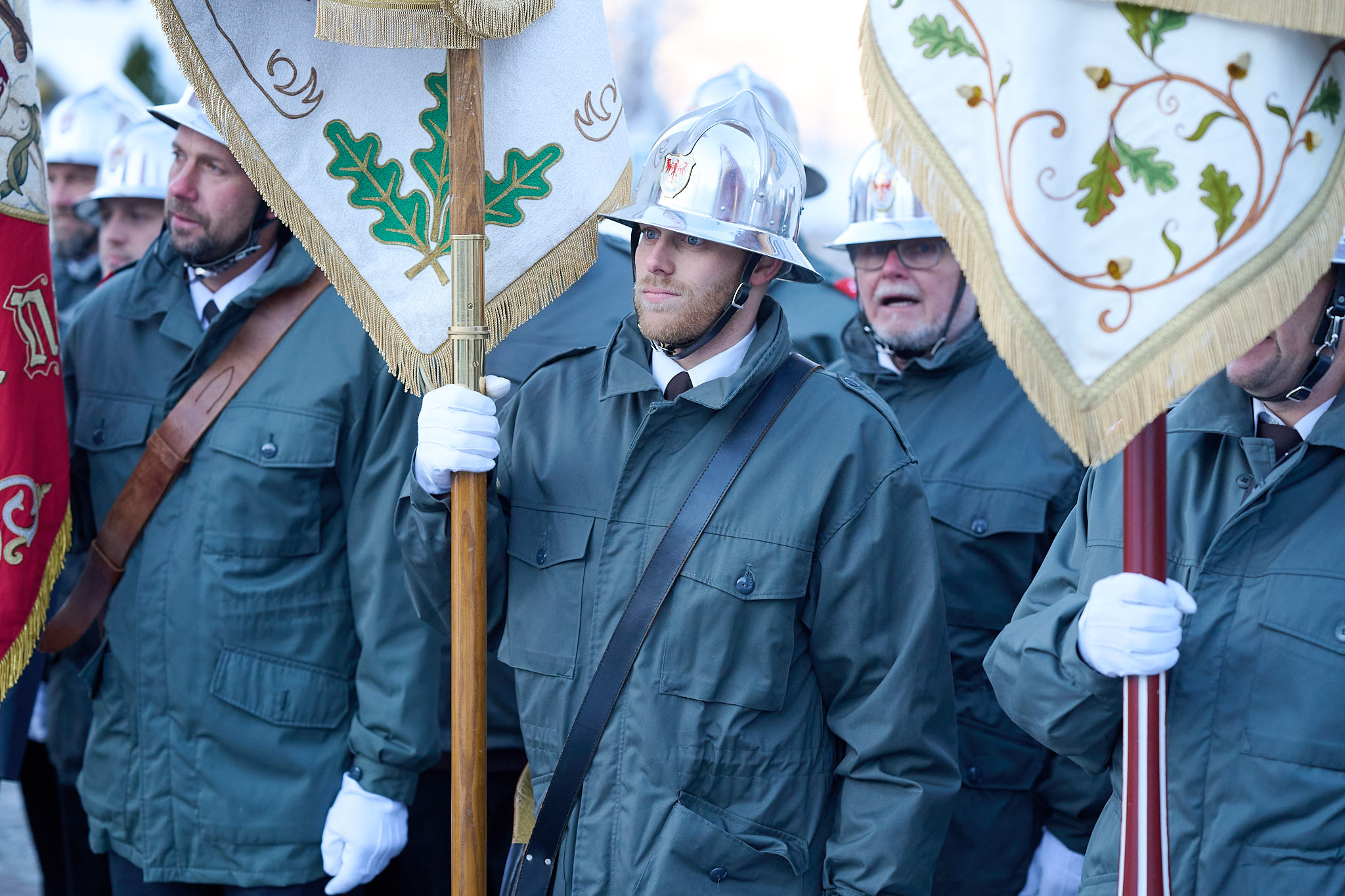 Pünktlich trat die Formation der Freiwilligen Feuerwehr Axams beim Pavillon an. Trotz klirrender Kälte präsentierten sich die Feuerwehrmitglieder mit beeindruckender Disziplin und sichtbarem Stolz. Unterstützt wurden sie von Fahnenabordnungen der Feuerwehren Grinzens, Birgitz, Götzens, Natters, Mutters und Kreith, sowie der Musikkapelle Axams, die dem Festakt einen würdevollen musikalischen Rahmen verlieh.