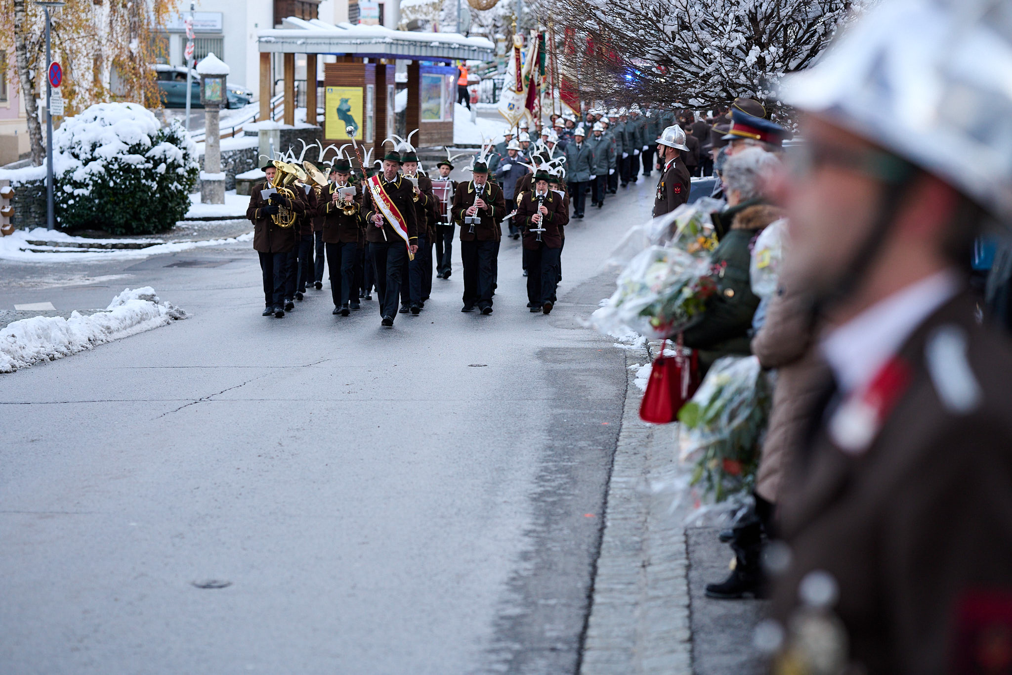 Nach dem Abschreiten formierten sich die Einheiten zum feierlichen Einmarsch. Mit einer Defilierung vor den Ehrengästen setzte sich der beeindruckende Zug Richtung Pfarrkirche Axams in Bewegung.