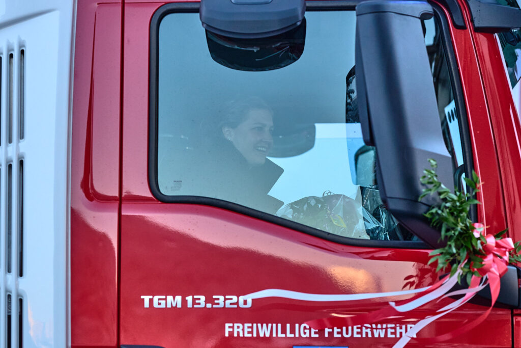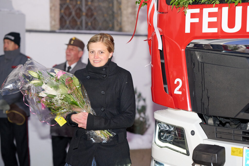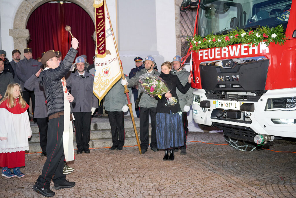 Nach seinen Worten trat Pfarrer Mag. Paul Kneussl gemeinsam mit der Fahrzeugpatin Petra Kirchebner, der Fahnenabordnung und dem Obermaschinisten OLM Christoph Kofler zur eigentlichen Segnung des Fahrzeugs. Mit Weihwasser, Gebet und einem feierlichen Segensspruch wurde das Tanklöschfahrzeug unter den Schutz Gottes gestellt. Die Patin Petra Kirchebner, sichtbar bewegt und stolz, übernahm symbolisch ihre Rolle als Schutzpatronin des neuen Einsatzmittels.