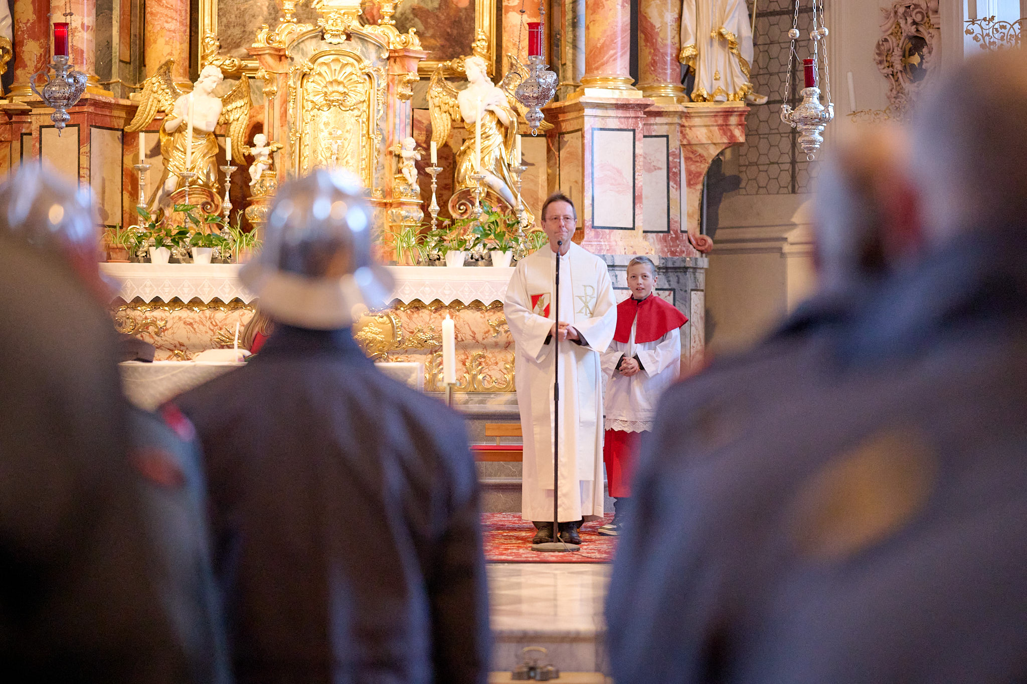 In der Pfarrkirche Axams erwartete die Festgesellschaft eine von Feuerwehrkurat Mag. Paul Kneussl gestaltete Messe. Der Kurat fand bewegende Worte über das Vertrauen in Gott, den Schutz des Nächsten und den Zusammenhalt innerhalb der Gemeinschaft. Besonders betonte er die Bedeutung der Einsatzkräfte, die tagtäglich bereitstehen, um im Notfall Leben zu retten und Werte zu schützen.