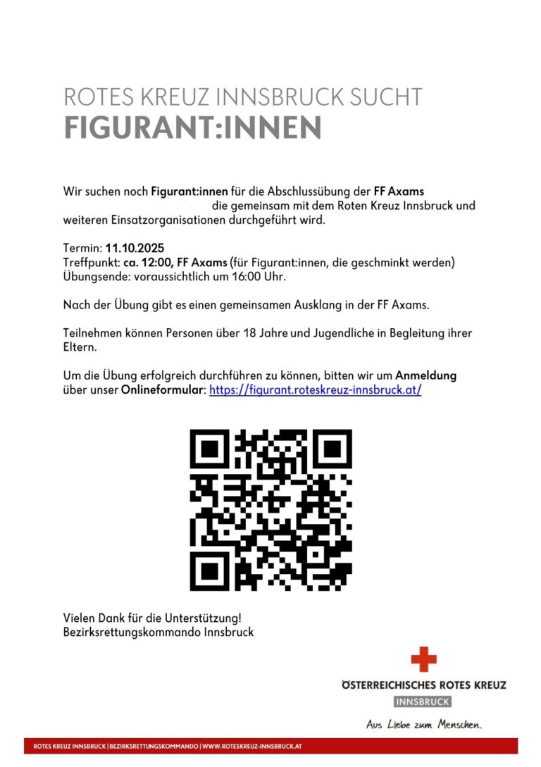 Für eine Gemeinschaftsübung zwischen der Freiwilligen Feuerwehr Axams und dem Roten Kreuz Innsbruck werden Übungsdarsteller gesucht.