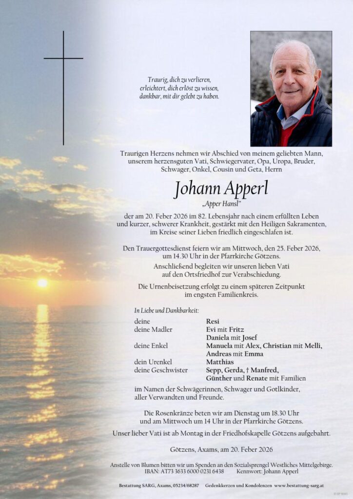 Johann Apperl verstorben Am 20.02.2026 ist unser langjähriger Kamerad Johann Apperl von uns gegangen. Weitere Artikel ansehen Vorheriger BeitragAufzugstop Nächster BeitragDies ist eine FEUERWEHRAUSFAHRT!
