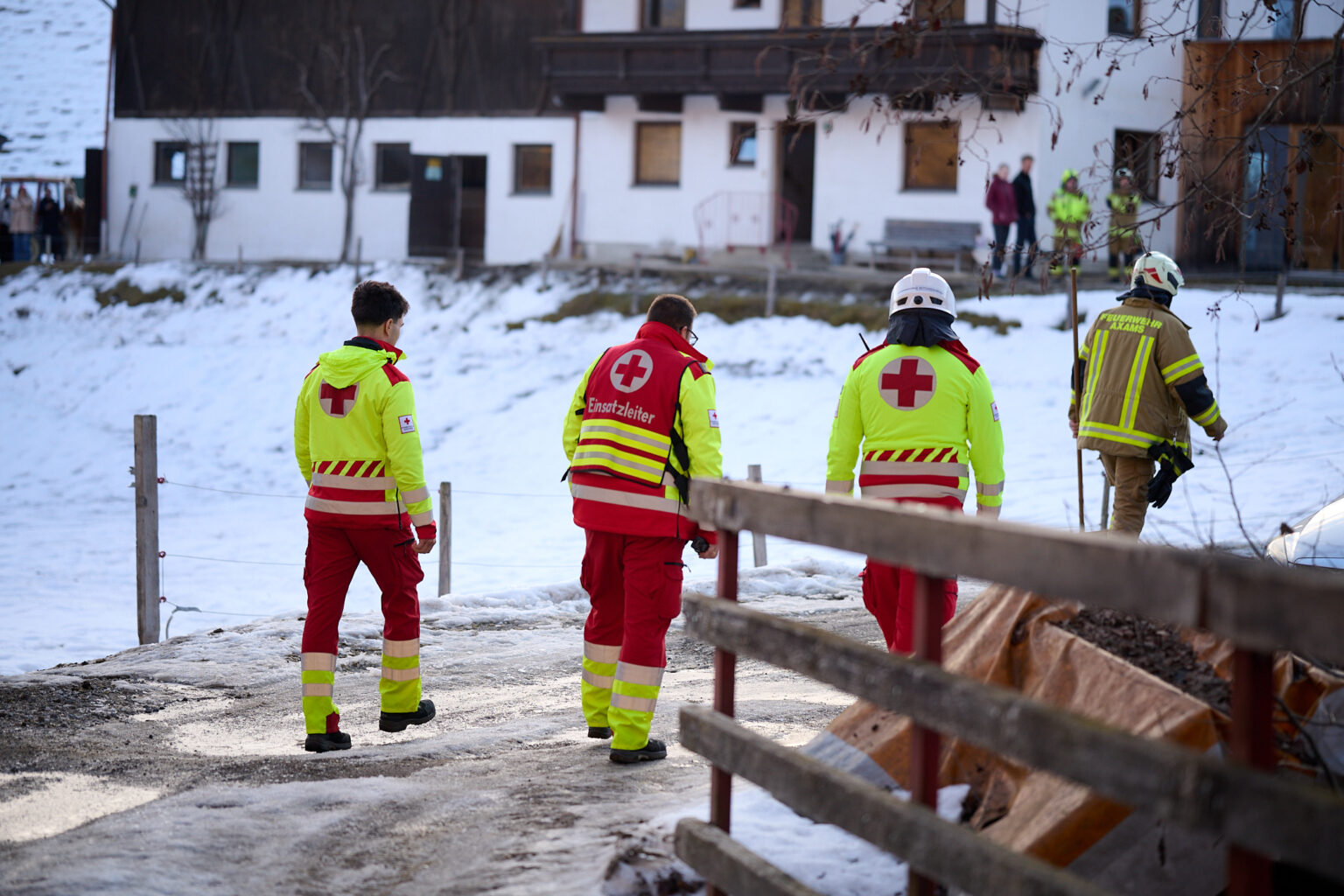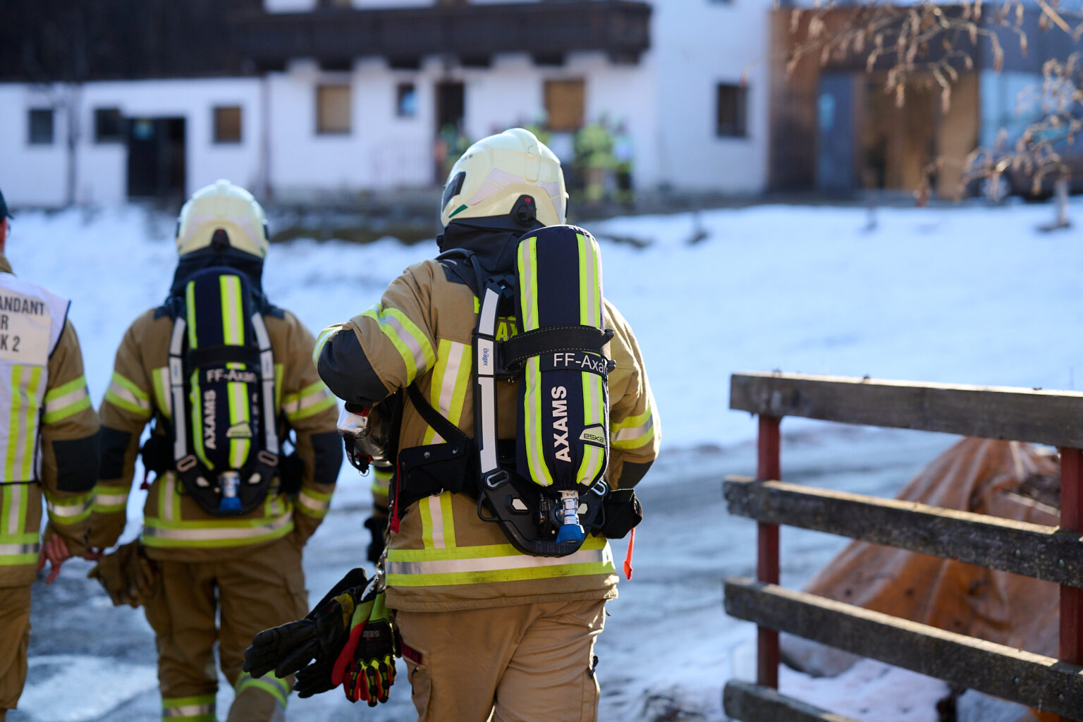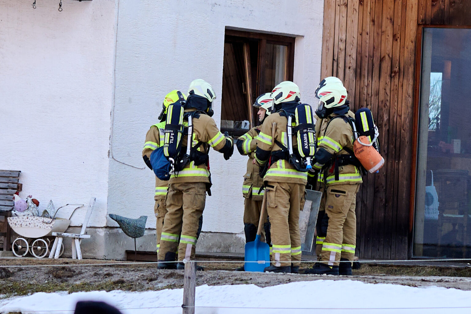 Zum Zeitpunkt der Alarmierung befanden sich mehrere Mitglieder gerade bei den Aufräumarbeiten nach dem Feuerwehrball 2026, wodurch das Kommandofahrzeug und das Tanklöschfahrzeug 1 rasch in Richtung Einsatzort ausrückten. Während die beiden Fahrzeuge die einspurige Straße von Norden her befuhren, näherte sich die Drehleiter von der südlichen Seite. Während sich der Atemschutztrupp darauf vorbereitete das Gebäude zu betreten und den Kamin über die Putztüre zu kontrollieren, verlegte die restliche Mannschaft vorsorglich eine Löschleitung bis hinter das Haus.
