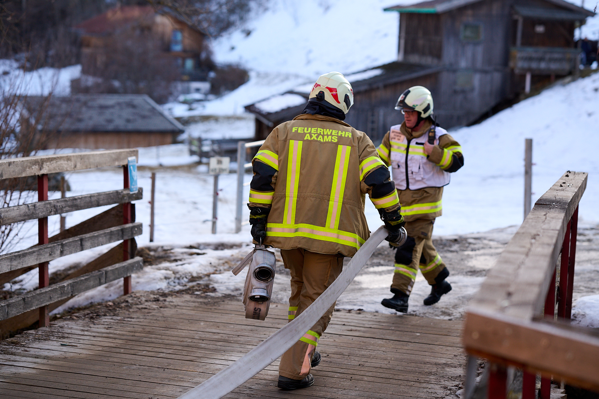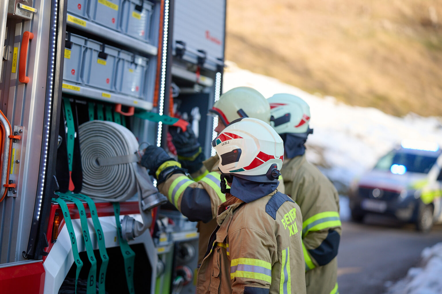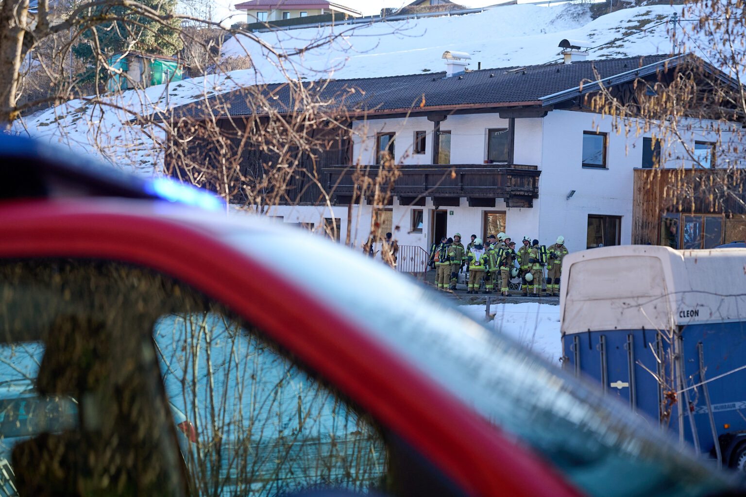 Zum Zeitpunkt der Alarmierung befanden sich mehrere Mitglieder gerade bei den Aufräumarbeiten nach dem Feuerwehrball 2026, wodurch das Kommandofahrzeug und das Tanklöschfahrzeug 1 rasch in Richtung Einsatzort ausrückten. Während die beiden Fahrzeuge die einspurige Straße von Norden her befuhren, näherte sich die Drehleiter von der südlichen Seite. Während sich der Atemschutztrupp darauf vorbereitete das Gebäude zu betreten und den Kamin über die Putztüre zu kontrollieren, verlegte die restliche Mannschaft vorsorglich eine Löschleitung bis hinter das Haus.