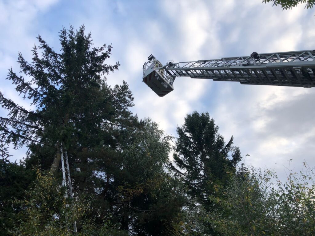 Vor Ort konnte die Katze mithilfe der Drehleiter in kürzester Zeit vom Baum gerettet und den Besitzern übergeben werden.