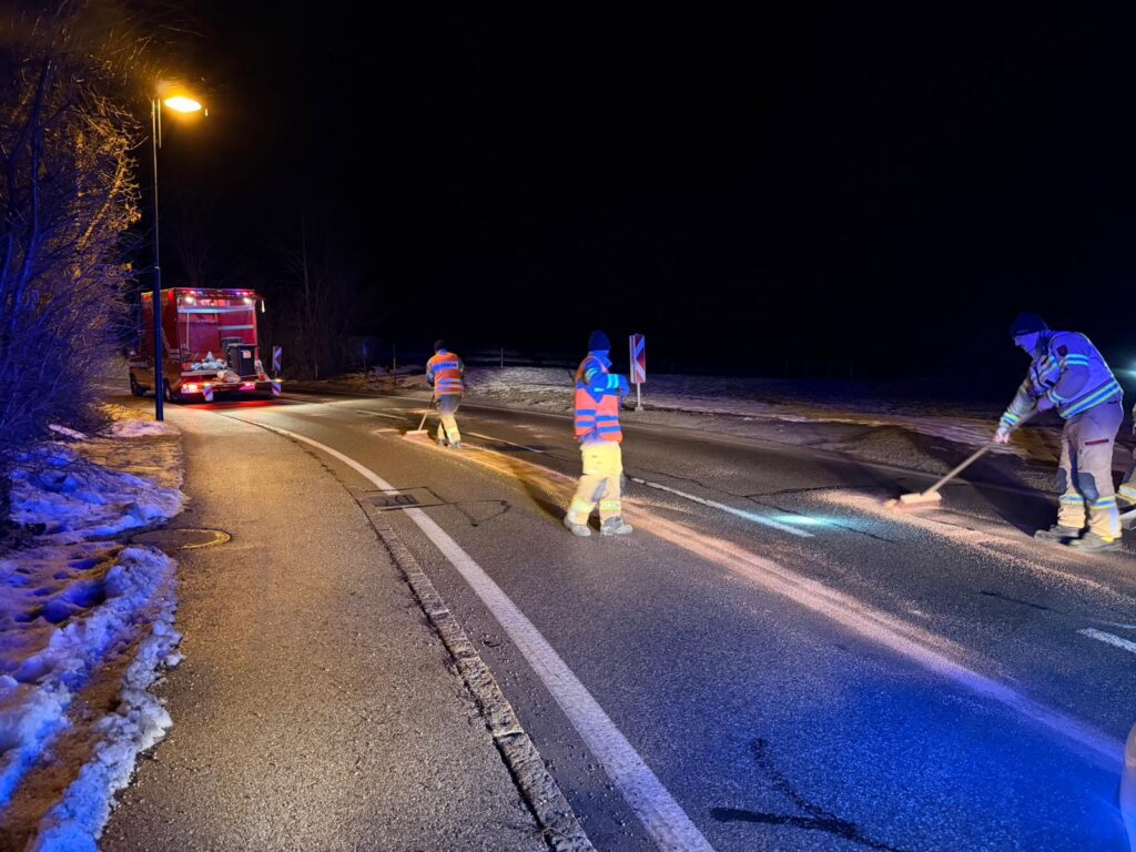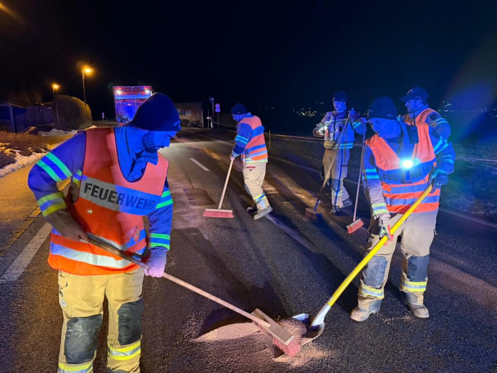 Während die Polizei die Verkehrsregelung übernahm, brachten die Feuerwehren Axams und Birgitz, beginnend bei der Ortsgrenze in Omes und endend in der Axamer Lizum, das Bindemittel auf, welches anschließend von der Kehrmaschine der Straßenmeisterei aufgesaugt wurde.