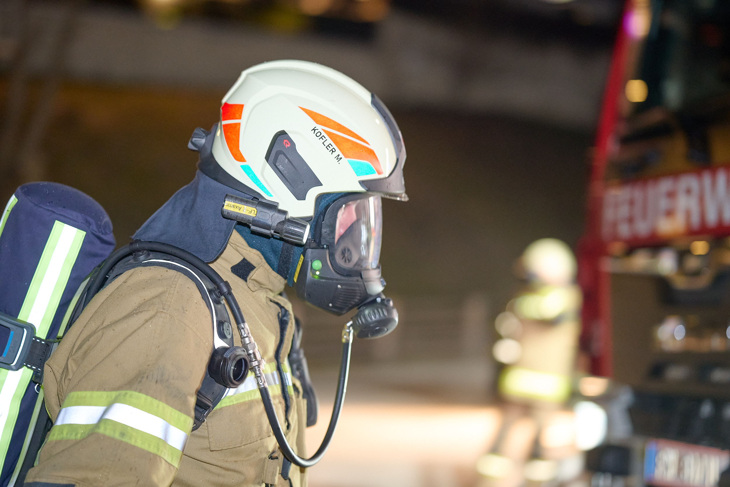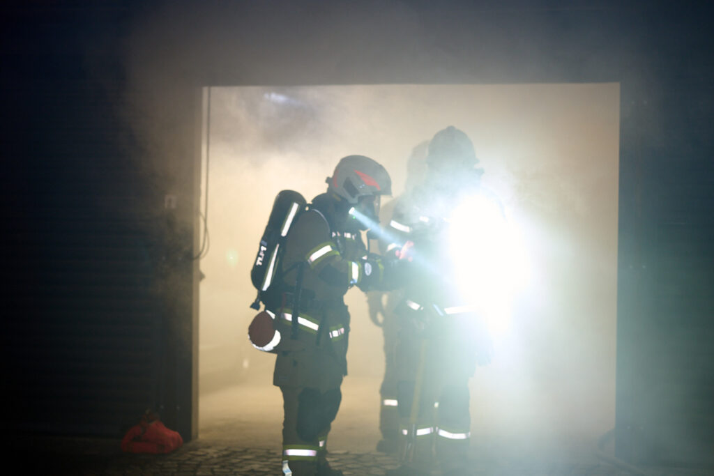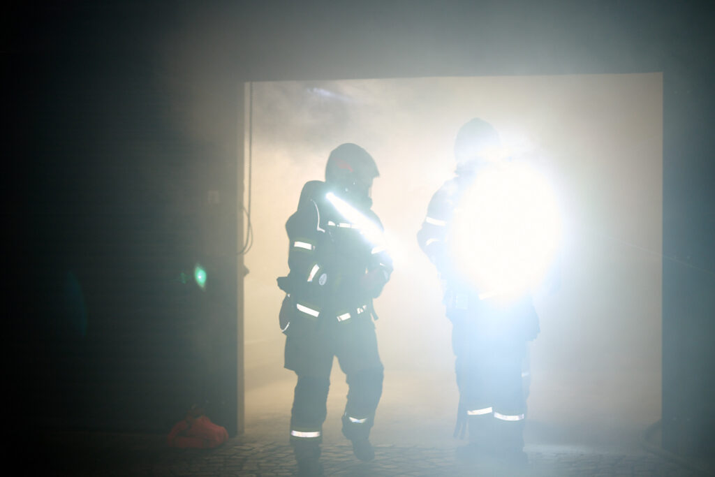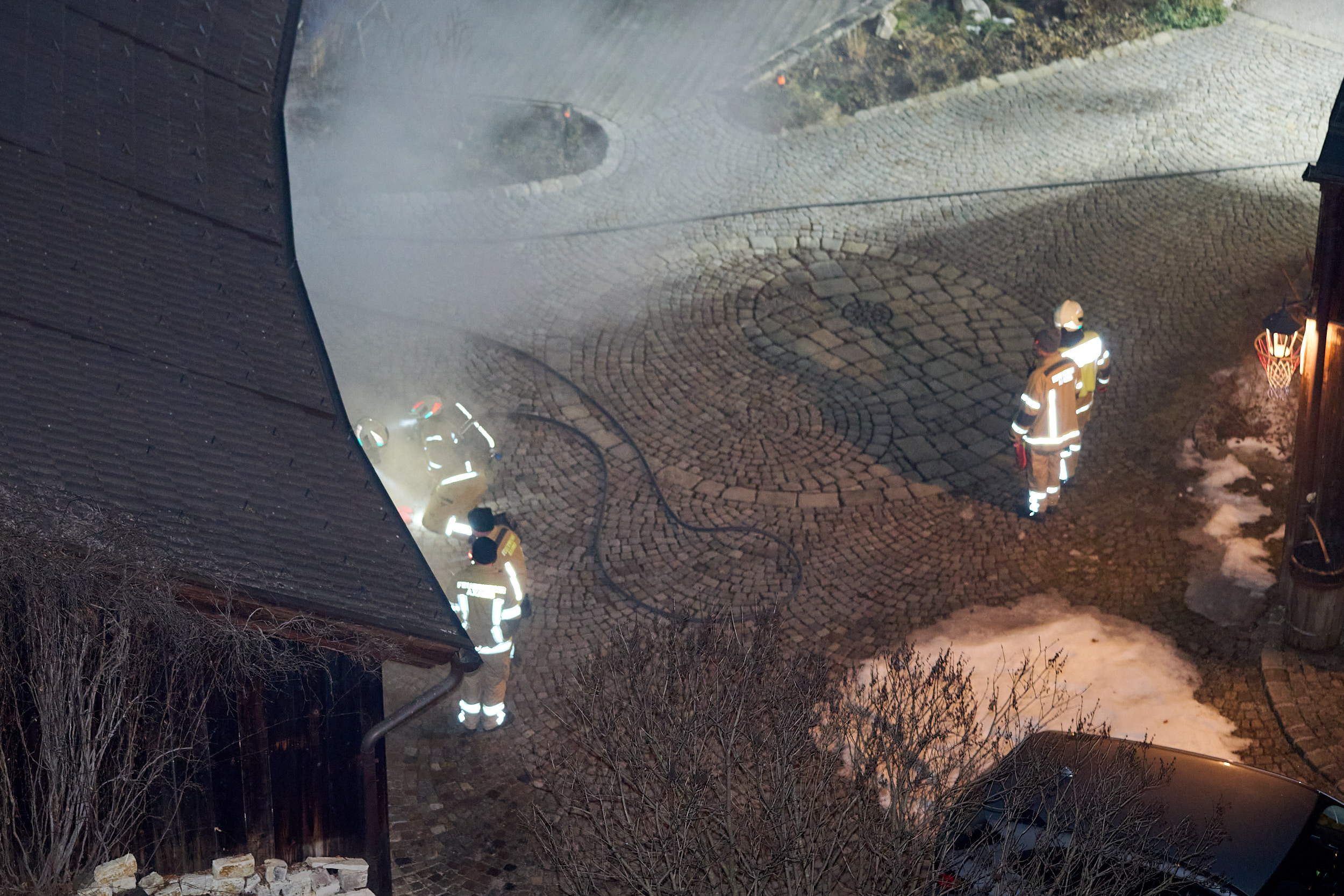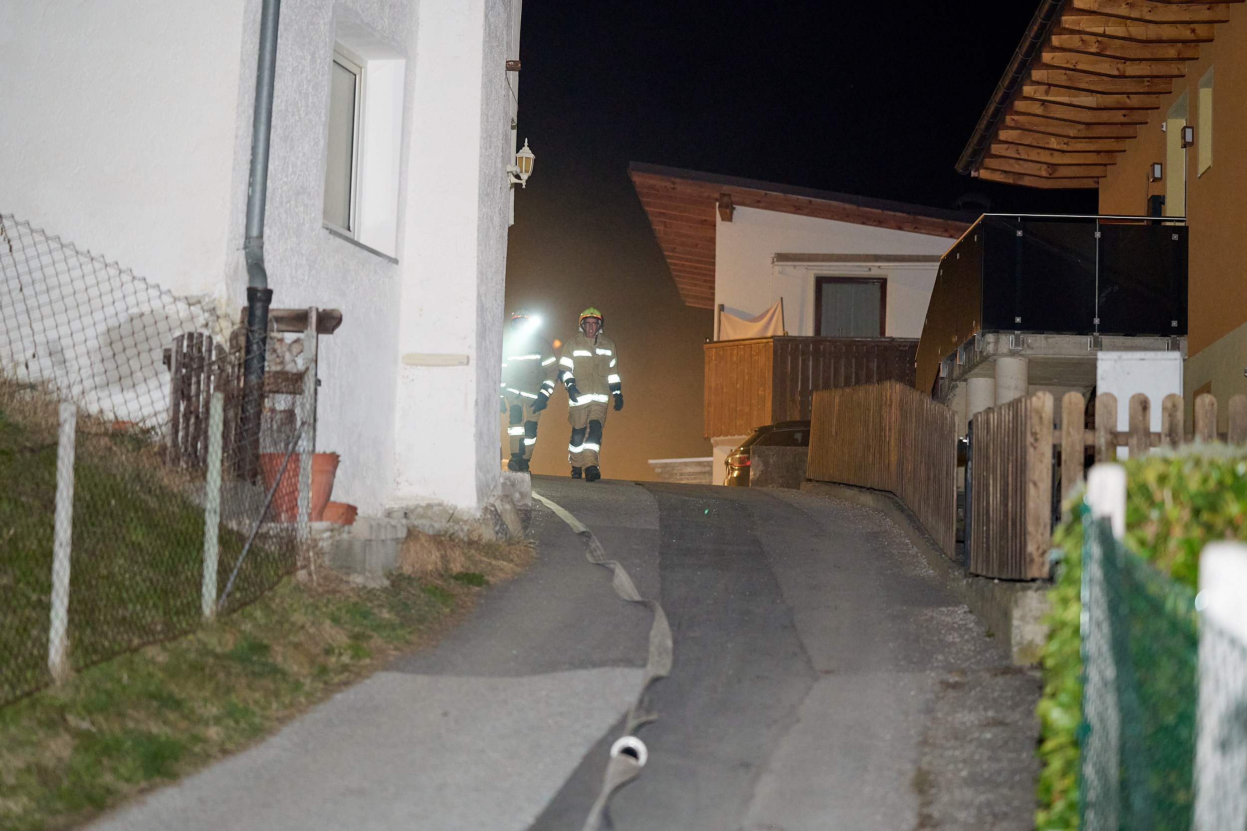Nach einer umfassenden Erkundung der Lage durch den Einsatzleiter startete die Besatzung des TLFA1 umgehend mit dem ersten Löschangriff. Ein Atemschutztrupp drang in die verrauchte Garage vor, lokalisierte die vermisste Person in kürzester Zeit und brachte diese sicher aus dem Gefahrenbereich. Zeitgleich positionierte sich das TLFA2, um eine weitere Brandausbreitung im Außenbereich zu verhindern. Die Mannschaft des zweiten Tanklöschfahrzeugs stellte zunächst den obligatorischen Reservetrupp für den Innenangriff und begann parallel dazu mit der Bekämpfung des Böschungsbrandes. Während dieser Arbeiten wurde eine zweite verletzte Person im steilen Gelände entdeckt, die zuvor eigenständig versucht hatte, die Flammen zu bändigen. In einer gemeinsamen Kraftanstrengung retteten die Kameraden von TLFA1 und TLFA2 die verunfallte Person mittels einer Schleifkorbtrage aus dem unwegsamen Gelände.