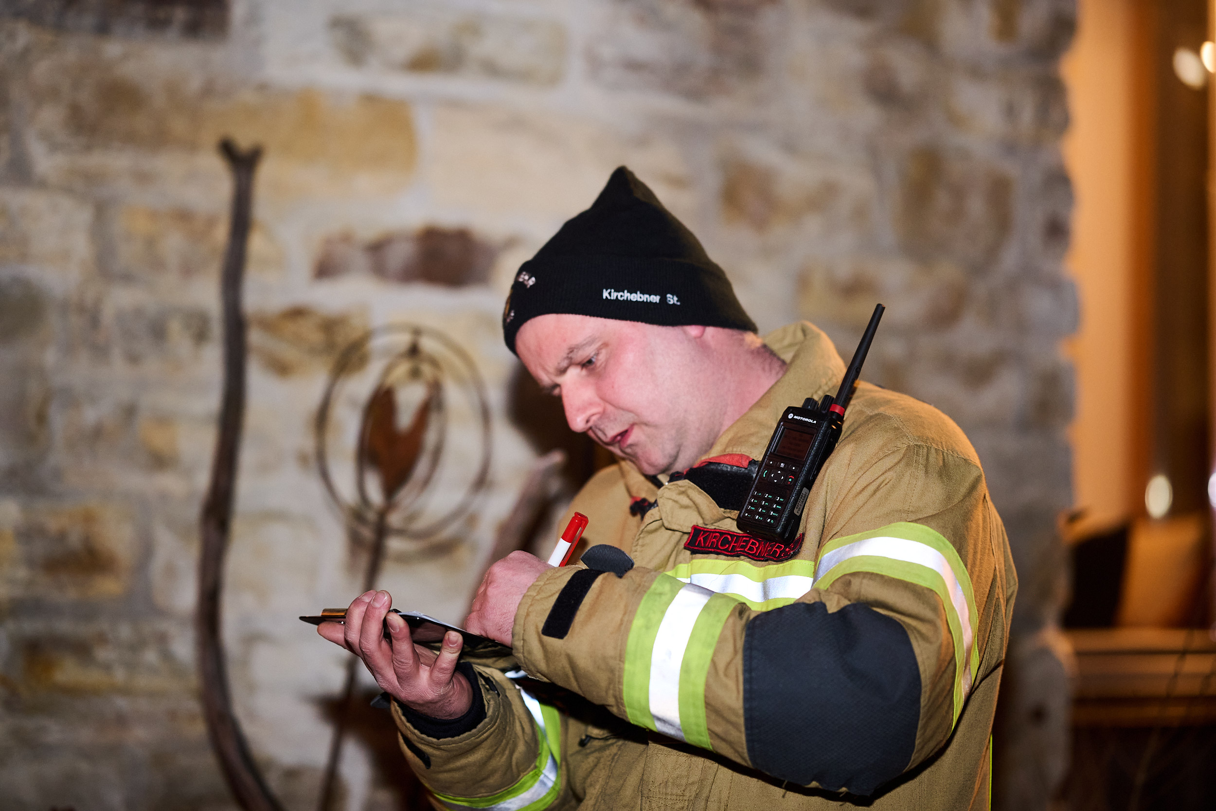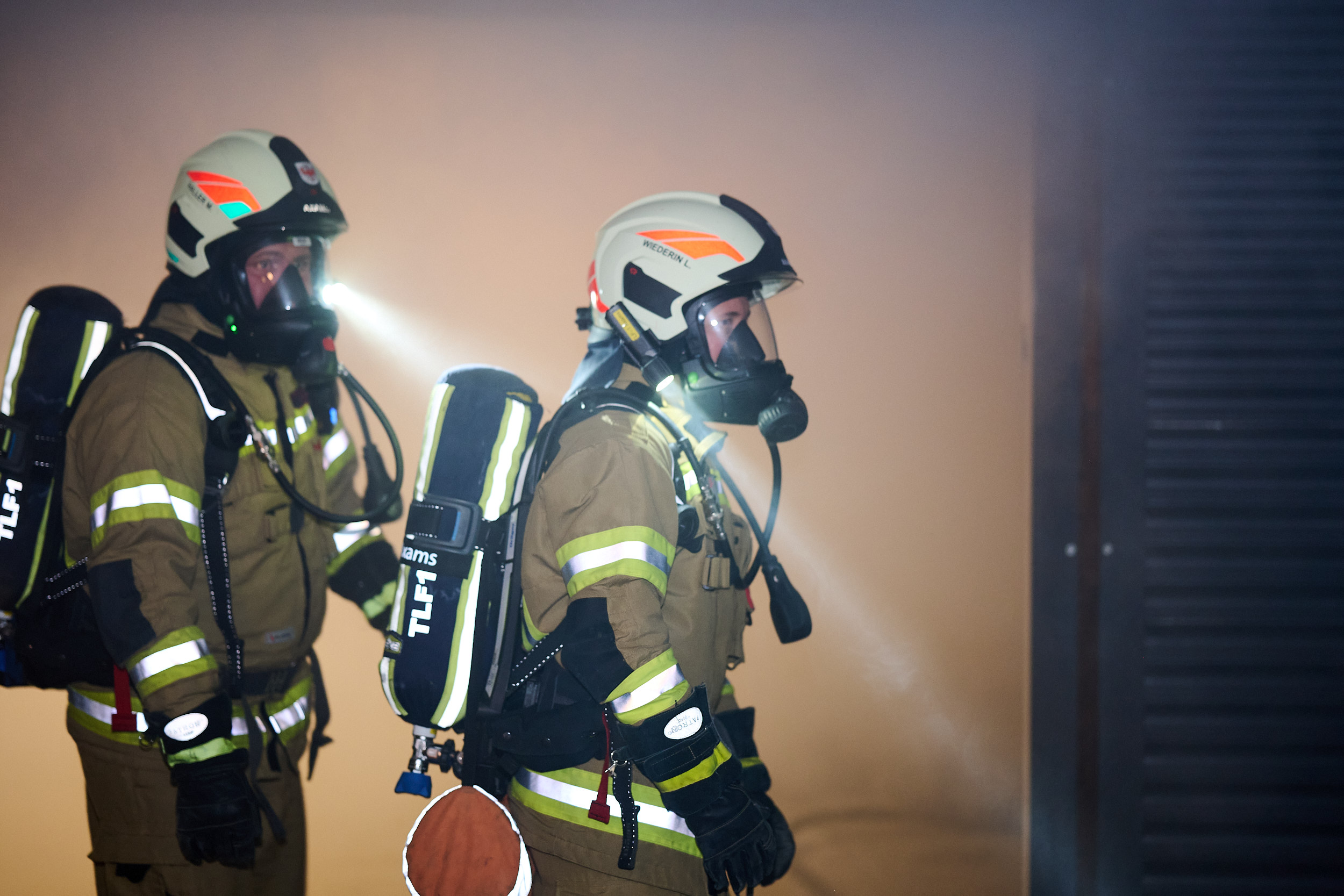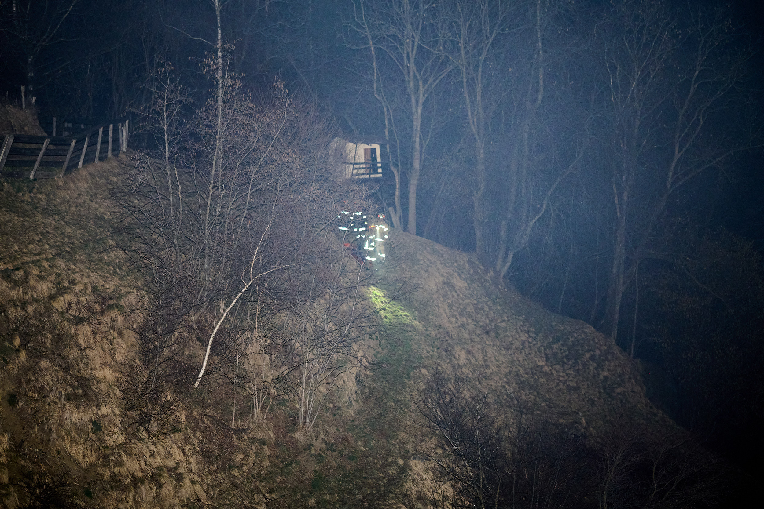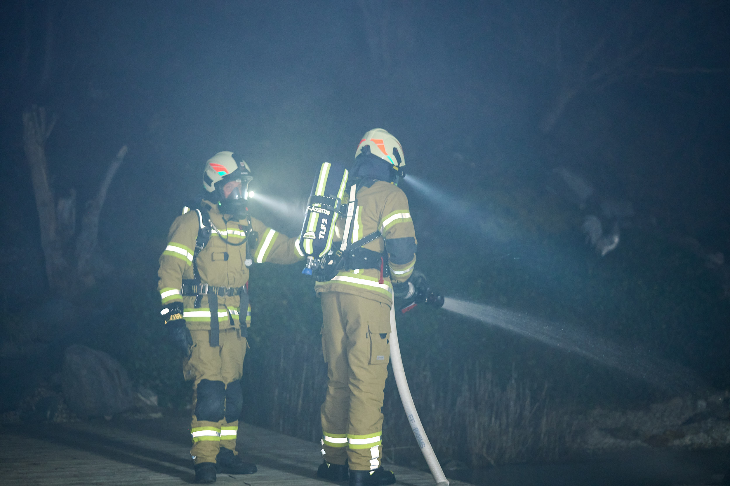 Nach einer umfassenden Erkundung der Lage durch den Einsatzleiter startete die Besatzung des TLFA1 umgehend mit dem ersten Löschangriff. Ein Atemschutztrupp drang in die verrauchte Garage vor, lokalisierte die vermisste Person in kürzester Zeit und brachte diese sicher aus dem Gefahrenbereich. Zeitgleich positionierte sich das TLFA2, um eine weitere Brandausbreitung im Außenbereich zu verhindern. Die Mannschaft des zweiten Tanklöschfahrzeugs stellte zunächst den obligatorischen Reservetrupp für den Innenangriff und begann parallel dazu mit der Bekämpfung des Böschungsbrandes. Während dieser Arbeiten wurde eine zweite verletzte Person im steilen Gelände entdeckt, die zuvor eigenständig versucht hatte, die Flammen zu bändigen. In einer gemeinsamen Kraftanstrengung retteten die Kameraden von TLFA1 und TLFA2 die verunfallte Person mittels einer Schleifkorbtrage aus dem unwegsamen Gelände.